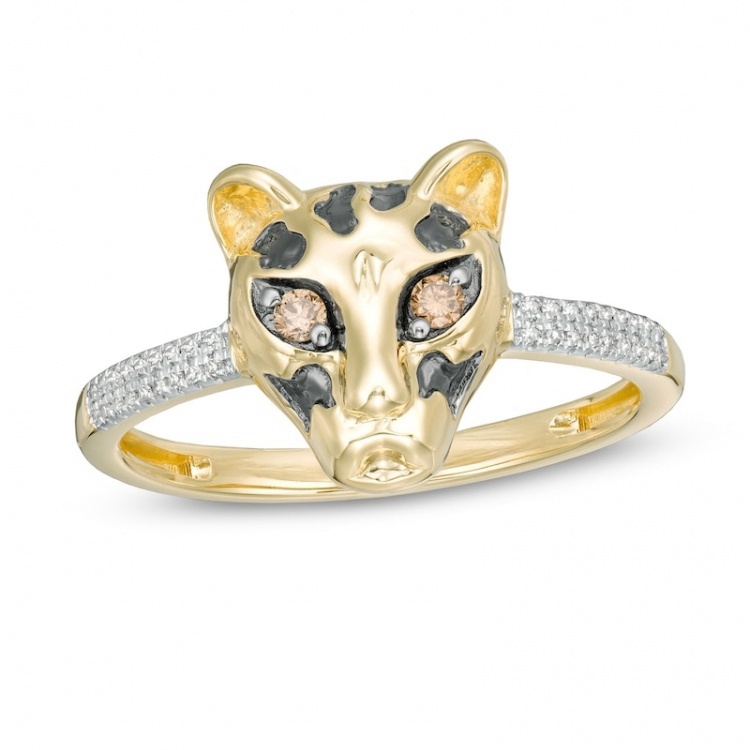 Crafted in warm 10K yellow gold and black rhodium plating, this ring showcases a sculpted cheetah head with captivating champagne diamond eyes and black rhodium plating speckled design. A double row of sparkling white diamonds set in the setting completes the look. With 1/10 carat diamonds and a brilliant polished finish, this ring exudes intense light.